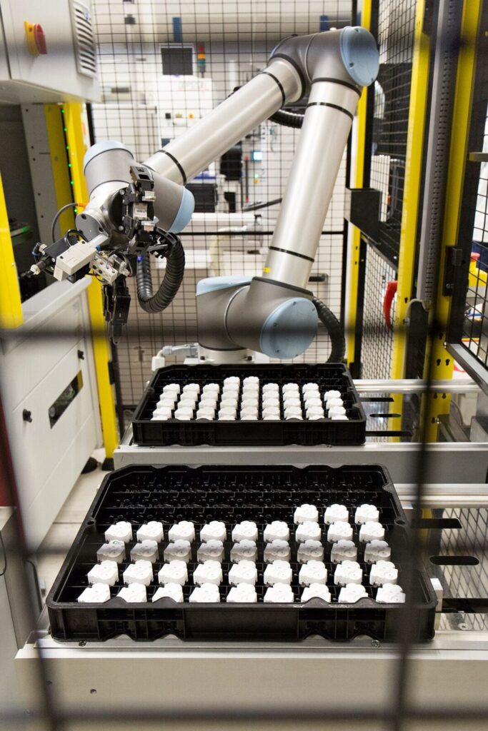 Nach einer zweitägigen Schulung können die zuständigen Mitarbeiter auch neue Programme für weitere spezifische Aufgaben des Cobots programmieren. Er arbeitet, wenn nötig direkt neben den Menschen, braucht aber weder eine permanente Überwachung noch vorgeschriebene bauliche Maßnahmen, um eingesetzt werden zu können. Dafür kann er nach dem 24/7 Takt arbeiten bzw. die Nachtschicht übernehmen.
