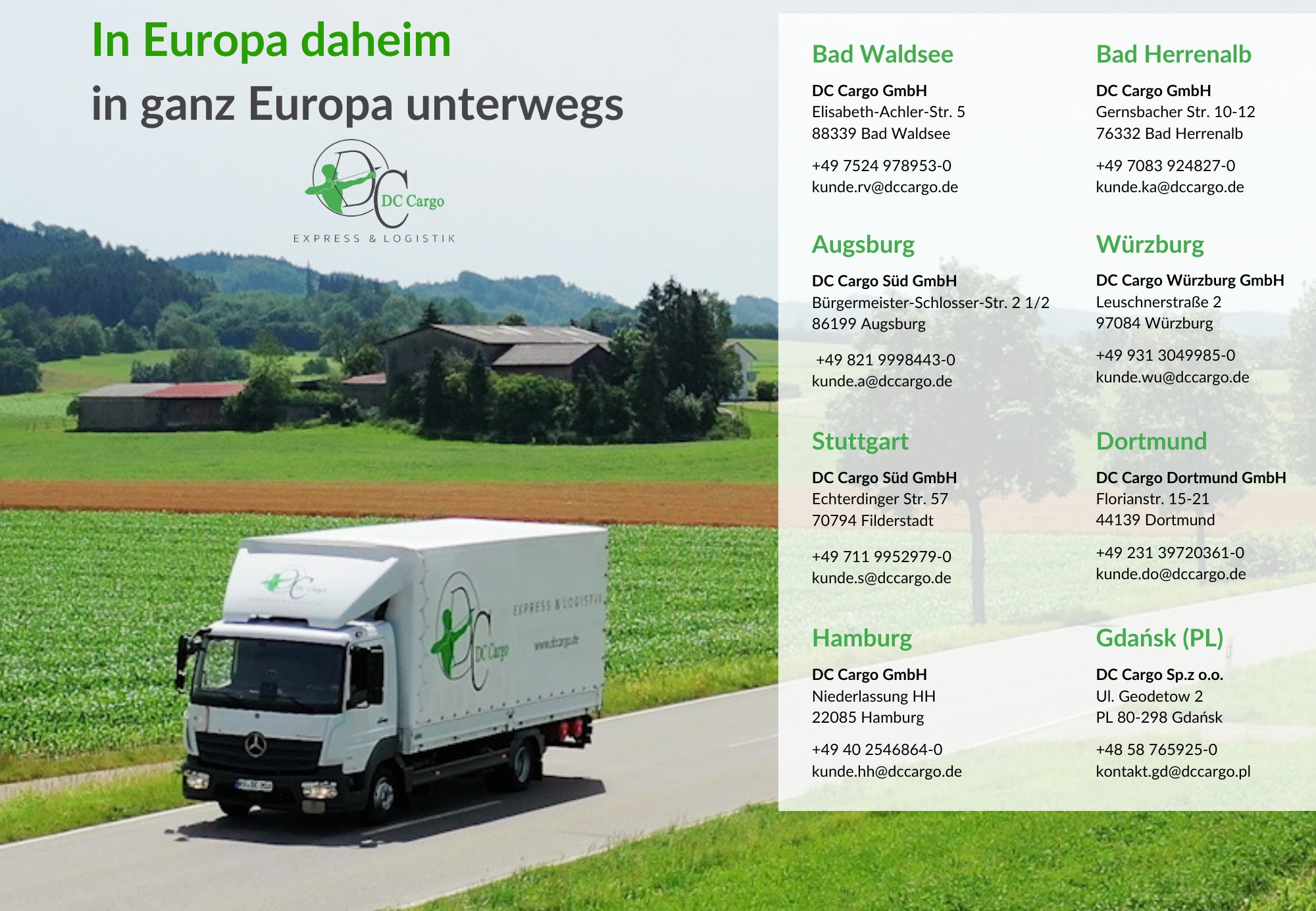 Der Hauptsitz der DC Cargo GmbH befindet sich in Bad Waldsee. Darüber hinaus ist das Unternehmen mit persönlichen Ansprechpartnern an acht weiteren Standorten deutschlandweit – darunter Bad Herrenalb, Augsburg, Würzburg, Stuttgart, Dortmund und Hamburg – sowie international in Danzig (Polen) vertreten.